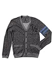 This grey cardigan features two front pockets, blue varsity stripes on the left sleeve, an embroidered "1/2" patch on the left chest and a grey button front closure.